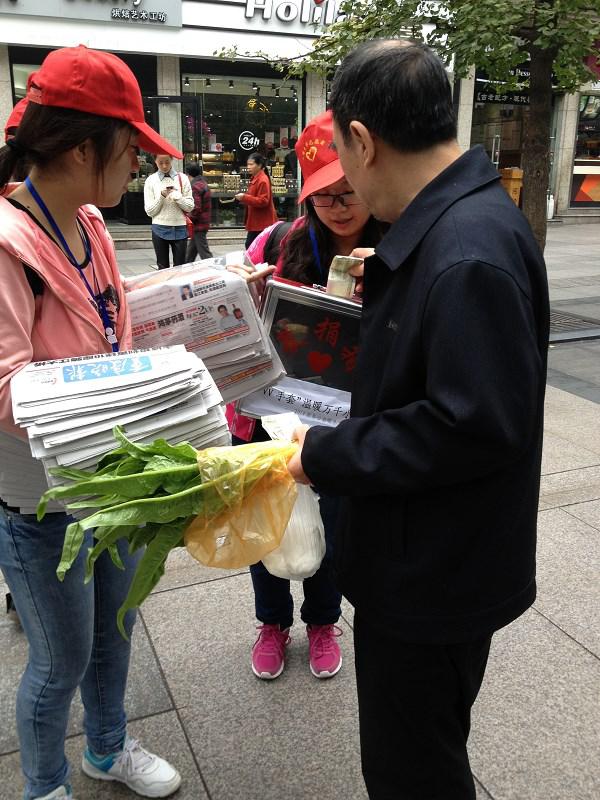 活动前会长将干部干事们分成六组分别在不同的地方进行义卖。活动期间干部干事们纷纷积极地向行走的路人推销报纸,阐述买这些报纸对贫困山区孩子们的重要性。虽然有的干事被拒绝多次,但干事们依旧以微笑去面对每个路人,耐心的向每个经过路人询问是否要献爱心。经过干事干部的不懈努力和广大市民的慷慨解囊,报纸在一份份的减少,爱心却在一点点的累积。相信这些贫困地区的孩子们也会越来越温暖,越来越幸福。