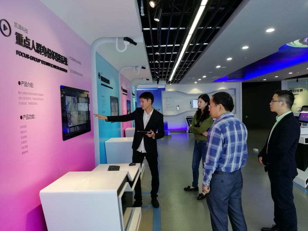 座谈交流会后,在凯泽公司李辉副董事长、吴军副董事长的陪同下,公司领导一行参观了凯泽科技展示馆,对方技术专家现场演示了人脸识别、人数统计、物体与应用场景识别等核心技术应用到安全、教育、医疗、交通、互联网等领域的过程,令考察组一行对人工智能和大数据的前沿技术及应用有了更直观、深刻的认识。