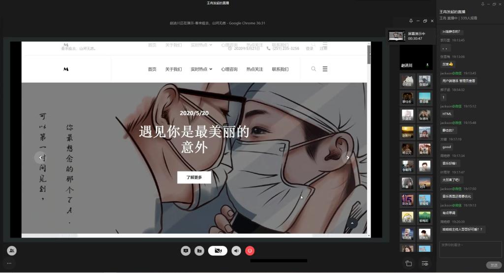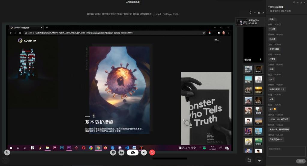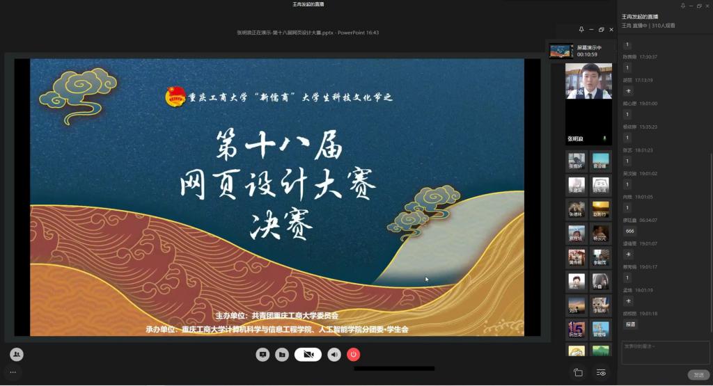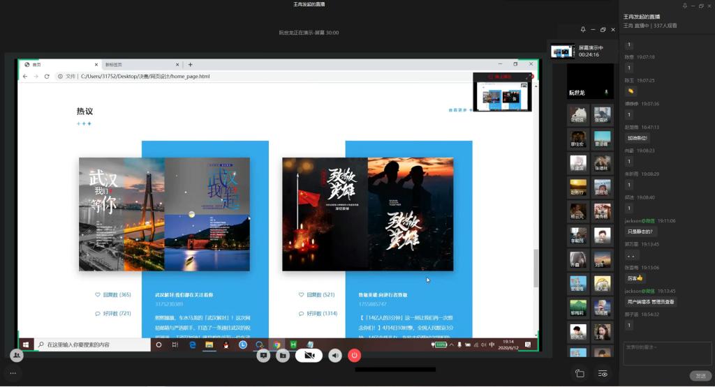 为弘扬伟大民族精神,厚植家国情怀,凝聚众志成城共抗疫情的强大力量,引导员工结合专业知识积极思考、实践,为抗疫贡献自己的智慧和力量,由校团委主办,best365官网入口注册、best365官网入口注册承办的“新儒商”老员工科技文化节之“共抗疫情,爱国力行”主题网页设计大赛决赛于6月12日晚上7点在企业微信直播间顺利举行。计信公司杨永斌副教授,杨艺副教授,唐灿副教授,赖涵博士应邀担任决赛评委。大赛邀请了校团委陆嘉副书记、计信公司分党委陈亚惠副书记、校团委徐阔老师,计信公司学工办副主任向巧老师观摩指导比赛。决赛受到了各公司员工广泛关注,吸引了超过800人次的观看。