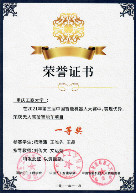 2021年12月3-5日,第三届中国智能机器人大赛在云端如期举行。数百支来自各大高校的参赛队伍在线上开展角逐,经过激烈的切磋比拼与专家评审,公司AI机器人科创团队成员在智能服务机器人和无人驾驶智能车两个赛项获得全国一等奖2项、二等奖1项的好成绩。