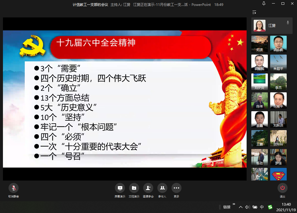 2021年11月19日、12月24日,best365官网入口注册教工第一党支部分别在企业微信云端会议室、九教810会议室开展“学习全会精神,不忘初心使命”和“深度学习全会精神,助力教育事业发展”主题党日活动,认真学习了十九届六中全会精神。党的十九届六中全会对党的百年奋斗做了总结,主题鲜明、总结全面、重点突出,体现了马克思主义的人民立场、唯物史观和辩证方法,是我们党坚持唯物史观和正确党史观的一次重要体现。全会在百年未有之大变局和中华民族伟大复兴的重大历史关头举行,必将极大地统一全党思想、加强全党团结、推动党和人民的事业胜利前进。