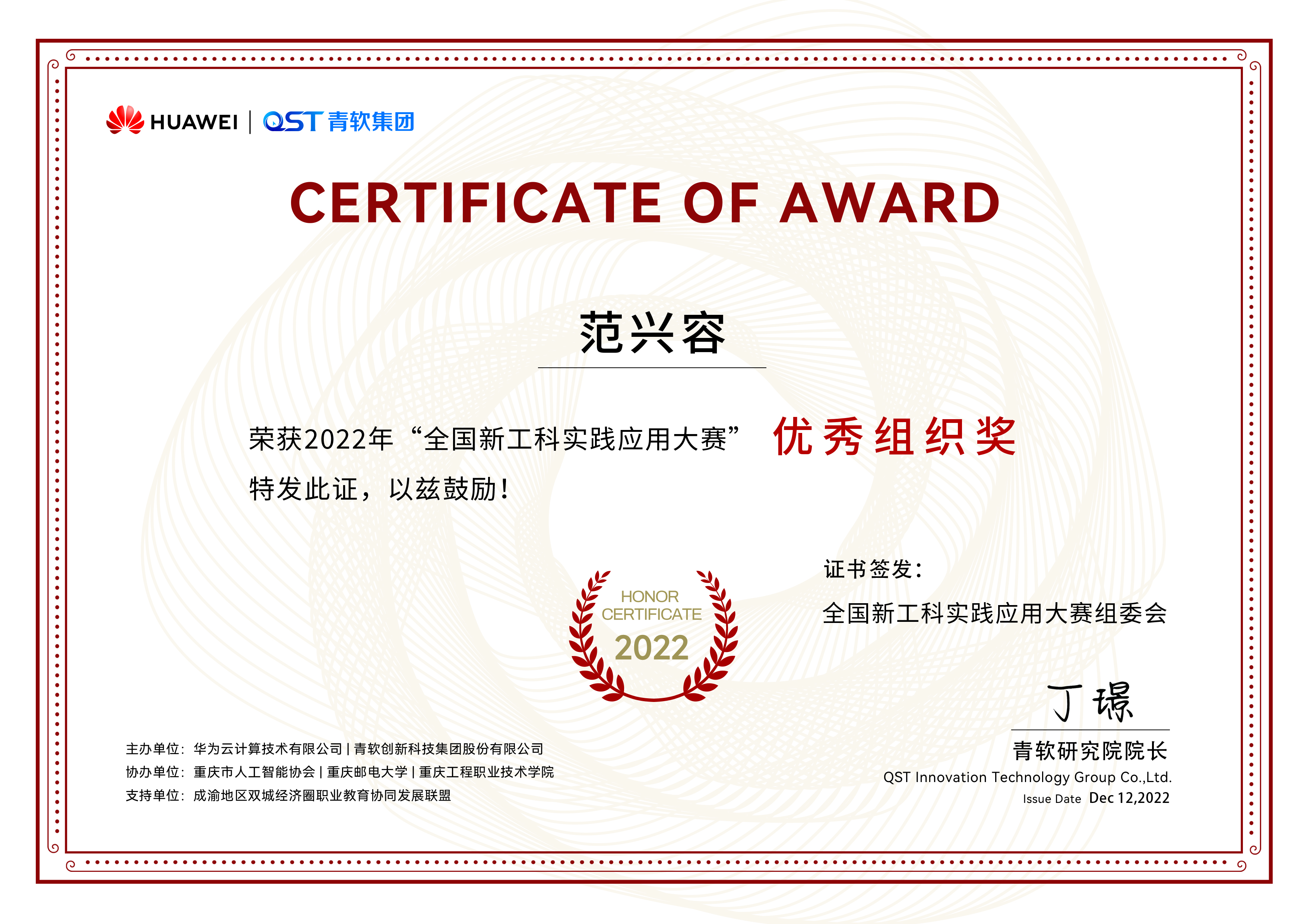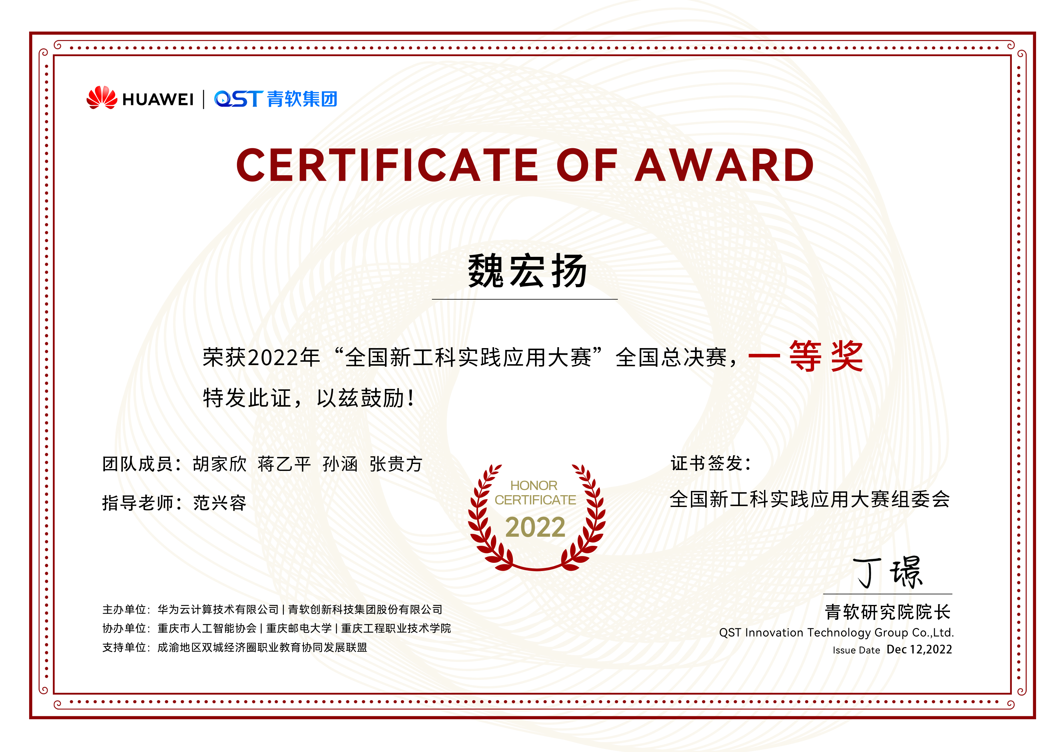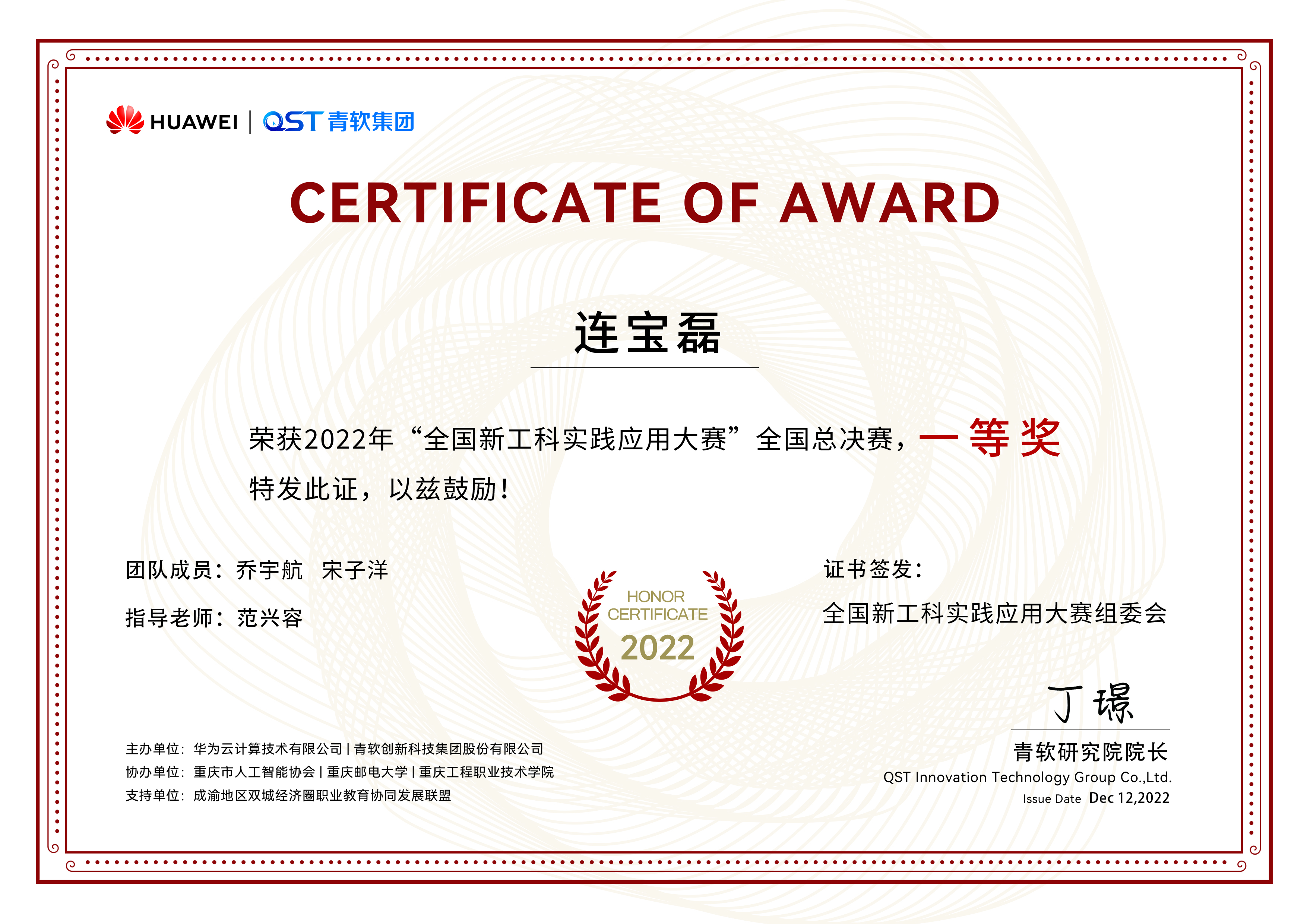 2022年11月21-30日,华为云2022年全国新工科实践应用大赛全国总决赛在云端如期举行。 数百支来自全国各大高校的参赛队伍在线上展开⻆逐,经过激烈的切磋比拼与专家评审,公司 best365官网入口注册学子在AR科创团队指导教师范兴容博士指导下获得全国一等奖2项的好成绩。