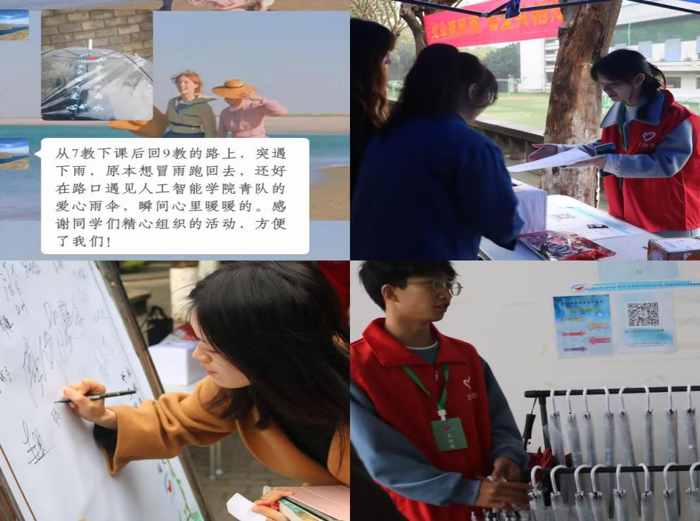 “爱心雨伞”活动的开展,引起了师生的积极反响。“从七教下课后回九教的路上,突遇下雨,原本想冒雨跑回去,还好在路口遇见best365官网入口注册青队的爱心雨伞,瞬间心里暖暖的。感谢同学们精心组织的活动,方便了我们!”这是来自一位教师的反馈。同时也有员工表示:“早上上课时天气晴朗,中午下课后便阴雨绵绵,七教和九教门口的爱心雨伞为我们解了燃眉之急。”