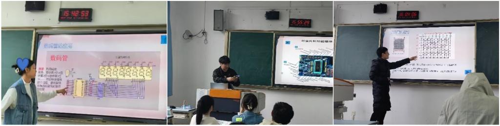 活动伊始,叶清源同学对什么是单片机和单片机功能模块进行简单介绍,并且展示了数码管和矩阵键盘的应用,创作了基于矩阵键盘所编程实现的贪吃蛇游戏;接着邓洪同学向大家介绍了蜂鸣器的应用,并展示了蜂鸣器模拟炸弹定时器音效;最后,武明方同学对点阵屏功能模块进行介绍,介绍了点阵屏的结构和原理,展示了通过点阵屏显示流动字幕“新年快乐”。三位同学的成果展示,激发了同学们对单片机的学习兴趣。