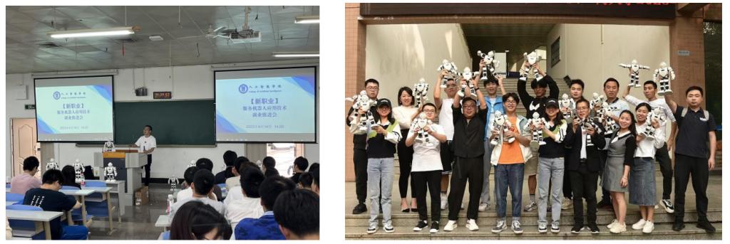 推进会的过程非常生动,现场气氛十分热烈,不仅向同学们清晰的讲述了当前智能服务机器人的分类及主要应用场景,智能服务机器人相关的主要就业岗位:ROS机器人调试员、机器人维护员、机器人装配技术员、机器人应用技术员及机器人维修工等岗位的市场需求、人才缺口、工作环境及薪资待遇等,现场智能服务机器人EBOT、“偃师”还组合编队进行了独特有趣的舞蹈表演。
