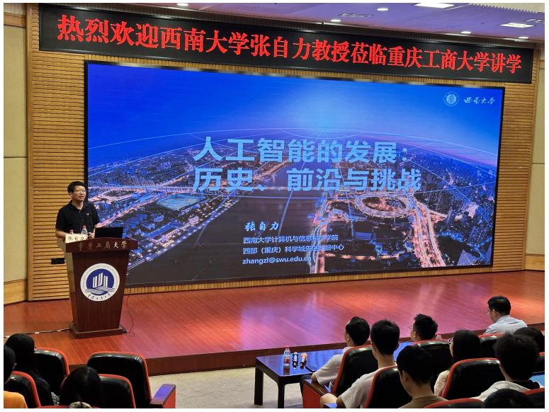 6月8日下午,西南大学计算机与信息科技公司的张自力教授莅临best365官方网站,为师生带来了一场以“人工智能的发展:历史、前沿与挑战”为主题的精彩的学术报告。研工部副部长、研究生院副经理邓龙奎、best365官网入口注册经理唐亮贵出席讲座,各研究生组织成员以及研究生代表到场参加。