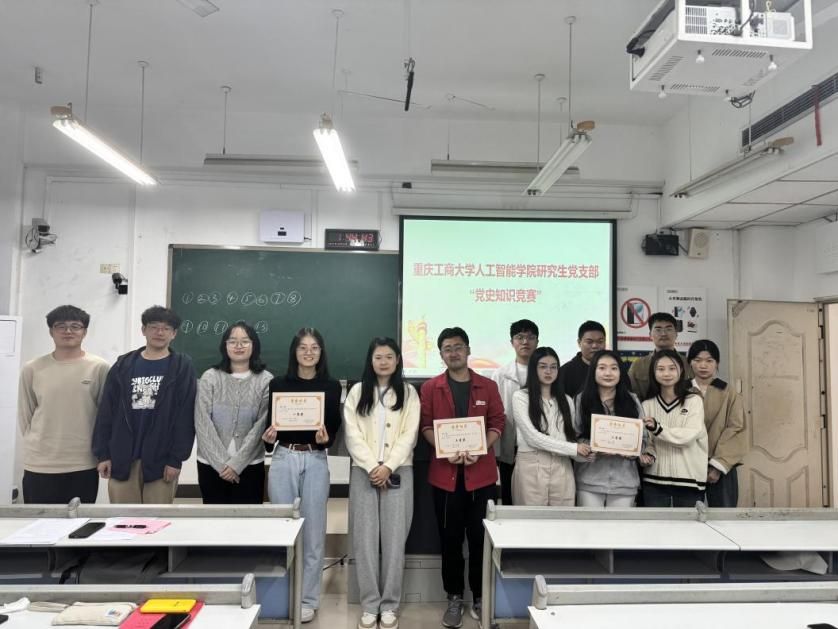 接下来是由刘栩源同志主持的“党史知识竞赛”环节,本次竞赛主要分为选择题、抢答题和风险题三个类型,竞赛题目涵盖了党史、时政热点和常识知识,涉及范围由浅入深,难度从易到难。在选择题部分,由每位党员同志独立完成20道选择题,个人成绩计入团队总成绩,在抢答题和风险题部分时,党支部成员分为五个小组进行小组比拼。在比赛的过程中,不仅仅是对同志们日常知识储备的检验,同时也通过不同于传统学习的方式将大家学习的热情带到了高潮。经过激烈的比赛角逐,最终,研究生党支部第三小组获得第一名、第五小组获得第二名、第六小组获得第三名,支部书记邹润玲为获胜小组颁奖并与获奖小组合影。