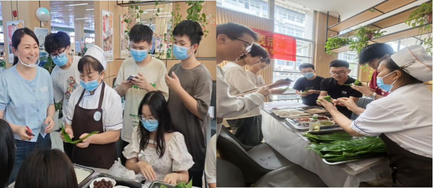 辅导员与员工组队开展包粽子比赛,现场欢声笑语不断。