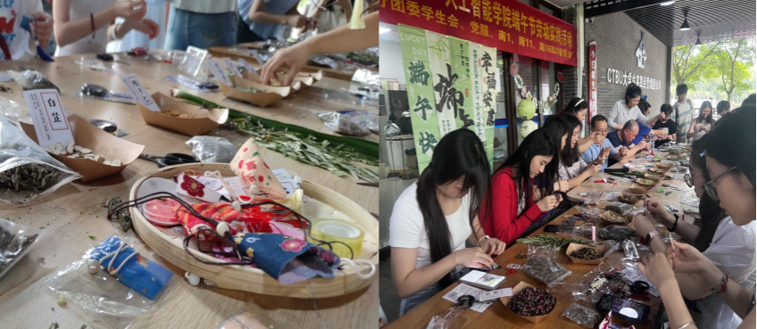 创意香包DIY现场,20余种香料芬芳四溢,师生们自由挑选搭配,将艾草、薄荷等药材装入香囊,寄托美好愿景。