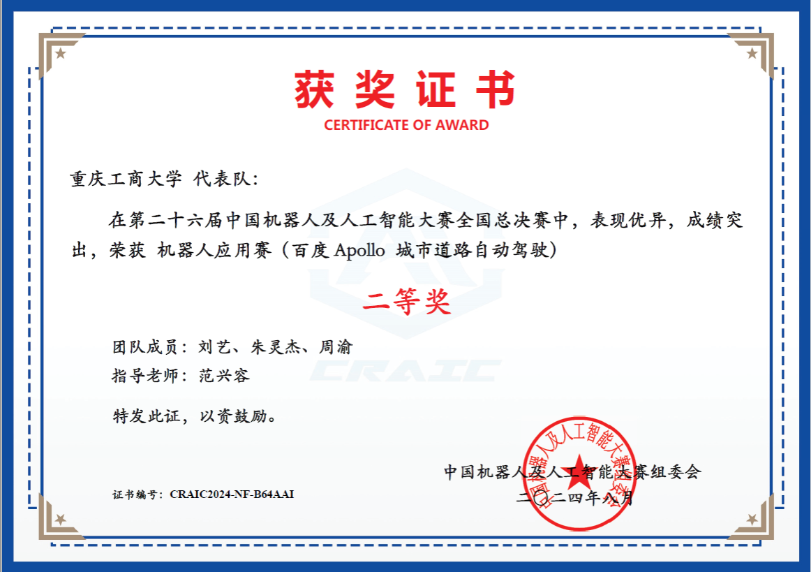 8月25日,第二十六届中国机器人及人工智能大赛全国总决赛在江苏宜兴成功举行。来自清华大学、哈尔滨工业大学、浙江大学等208所高校的407支队伍、1300余名选手,就自动驾驶、机器人、人工智能等领域的前沿技术展开激烈角逐和技术交流。此次盛会吸引了超过200位机器人与人工智能领域的专家学者、行业精英,共同探讨前沿技术与实际应用。在此次大赛中,公司best365官网入口注册AI机器人科创团队表现优异,在“百度Apollo城市道路自动驾驶”赛项中斩获全国二等奖(团队成员:刘艺、朱灵杰、周渝,指导教师:范兴容)。