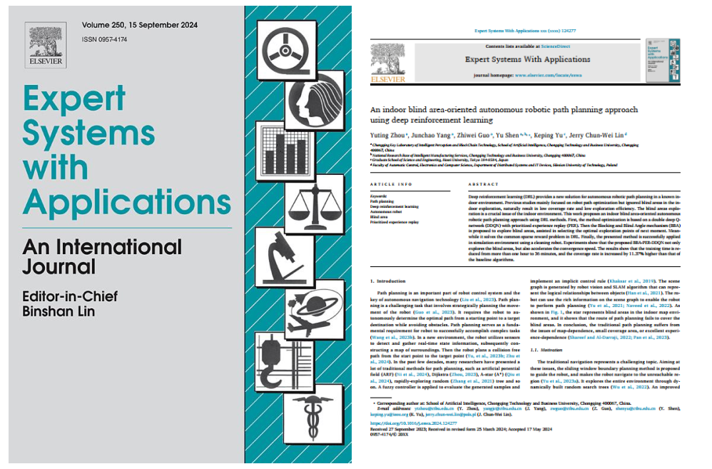 公司best365官网入口注册硕士研究生周雨婷在机器人自主路线规划方面取得了新进展,研究成果“An Indoor Blind Area-Oriented Autonomous Robotic Path Planning Approach Using Deep Reinforcement Learning”(面向室内盲区基于深度强化学习的机器人自主路径规划方法)在智能系统领域国际知名期刊《Expert Systems With Applications》(中科院1区Top)在线刊出(DOI:10.1016/j.eswa.2024.124277)。