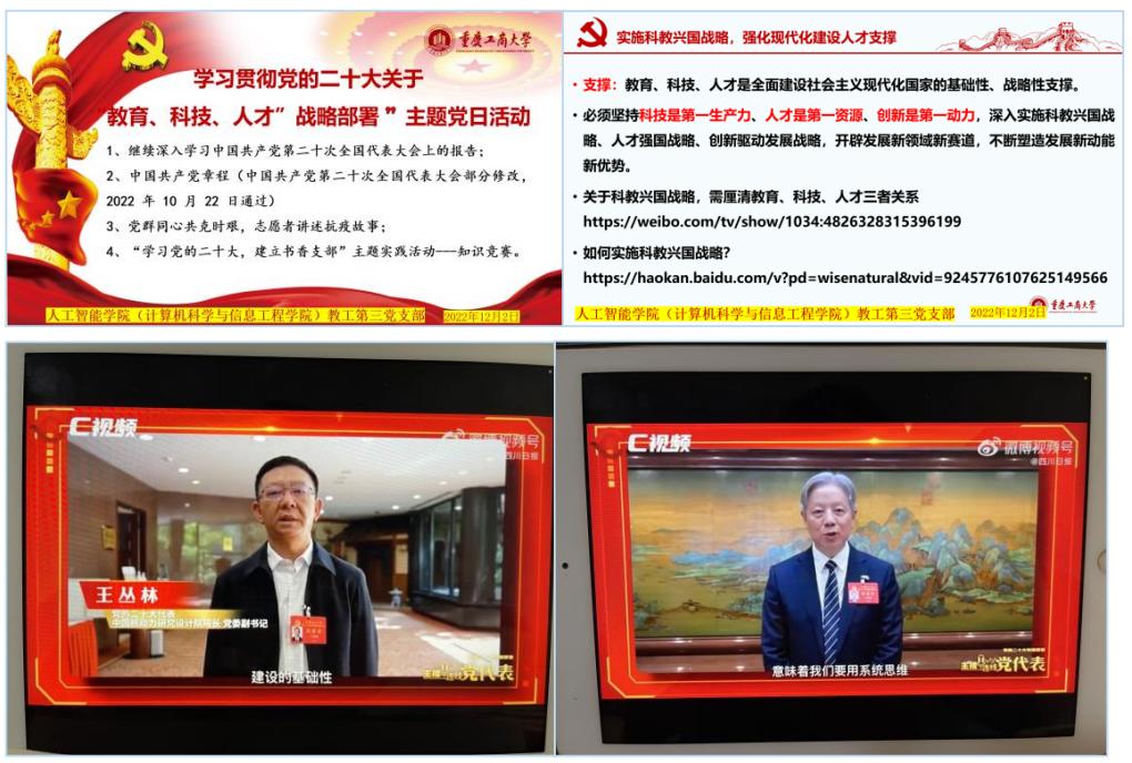 会上张翠玲同志首先领学了习近平总书记在党的二十大上报告中擘画的全面建成社会主义现代化强国的宏伟蓝图、“新时代新征程中国共产党的使命任务”和“加快构建新发展格局,着力推动高质量发展”的具体要求,学习了习总书记对教育、科技、人才工作的一体化部署。张翠玲同志解读了“教育、科技、人才是全面建设社会主义现代化国家的基础性、战略性支撑”和“科技、人才和创新的关系”,强调了新时代教育的基础性、先导性、全局性地位。然后全体党员观看二十大代表访谈录像,聆听他们关于“教育、科技、人才”关系的认识,深入学习代表们的典范故事,学习其深入贯彻落实习近平新时代中国特色社会主义思想、爱岗敬业、敢于担当、开拓创新、无私奉献的优秀品质和精神风范。支部全体党员深受鼓舞,纷纷表达学习心得。