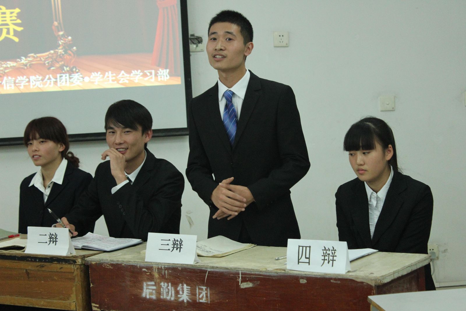 此场辩论赛的辩题为“我的中国梦”,院队队员分为两组,各执一词,围绕“老员工应该如何发展”展开激烈的辩证。正方的观点是“个人兴趣爱好对老员工发展更重要。” 正方辩手陈述:“老员工的发展和个人喜好紧密相关,梦想是人生发展的风向标,兴趣爱好才是老员工今后发展的关键因素。”反方却认为“考虑社会因素更利于老员工发展。”反方觉得老员工今后的发展应该更多考虑社会需求,以此作为就业发展的导向。双方彼此反驳,言辞慷慨激昂,场下掌声不断。同时同学们还给辩论队员提出了“是否梦想胜于一切”,“鲁迅为什么弃医从文”等问题,队员们详尽的回答得到了同学们的肯定。辩论结束后进行了辩论赛选手及主持人的培训,让对辩论感兴趣的同学有了一个学习的机会。
