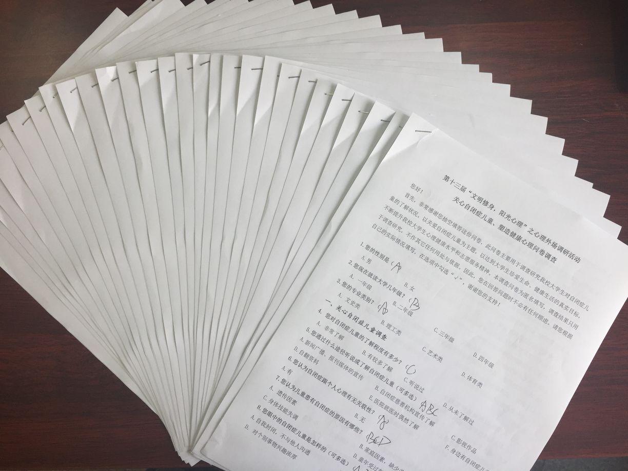 为进一步提升公司老员工心理健康水平,提高心理素质,构建积极、向上、阳光、自信的良好心态,更好的感受大公司园生活。由校员工处主办,best365官网入口注册承办的心理外场调研活动之关心自闭症儿童,塑造健康心理问卷调查活动成功举行。活动为期进行五天,收到来自公司不同公司不同专业的问卷调查共408份,其中,纸质问卷56份,电子问卷352份。