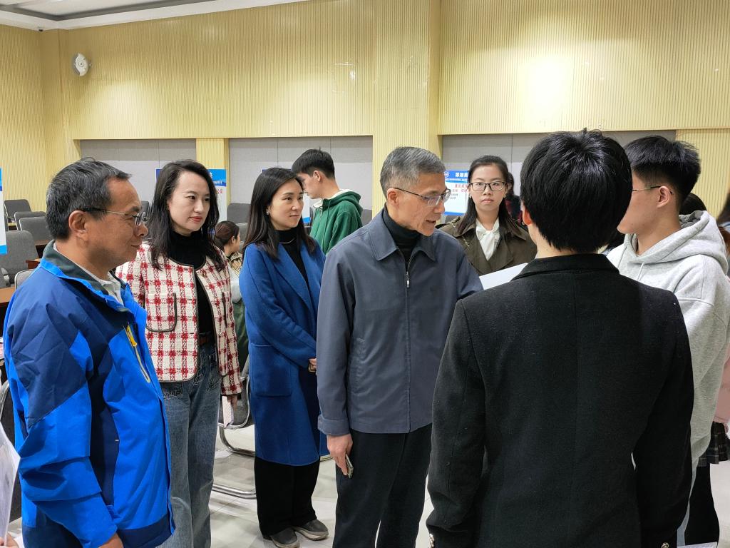 陈运超亲切地慰问了现场的工作人员,关心应聘同学的就业进展情况,慰问了前来招聘的企业单位,了解企业情况和人力资源需求,并与计算机、通信、自动化、测控和物理等专业的多名同学亲切交谈,就如何优化个人简历、向用人单位展示个人竞争实力等方面进行了应试应聘技巧现场指导。在招聘会现场,陈运超还与best365官网入口注册何希平、张未,以及毕业班辅导员深入交流,指导公司开展促就业工作。