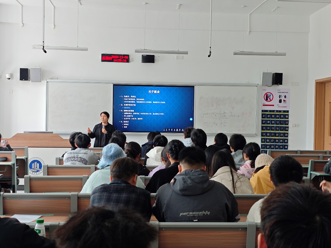在会议中,屈盈飞老师首先强调了“先就业、再择业”的理念。他指出,机会不是等待而来的,而是需要通过多次的尝试和努力才能争取到的。每个人的职业生涯都是一条独特的道路,而每一条就业路径都有自己的精彩,都是新的人生体验。老师鼓励同学们不要拘泥于单一选择,要勇于尝试,不断开拓自己的就业视野。