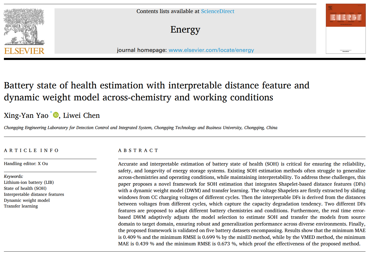 近日,计算机科学与技术专业2022级本科生陈力维(指导老师:姚行艳),在电池健康状态估计研究领域取得了重要进展,相关成果发表在国际顶级能源期刊《Energy》。该研究为电池健康管理技术领域提供了创新理论及应用支撑,并展现了公司在能源低碳及人工智能领域的科研实力,为团队建设及“双碳”战略目标实现注入新动能。
