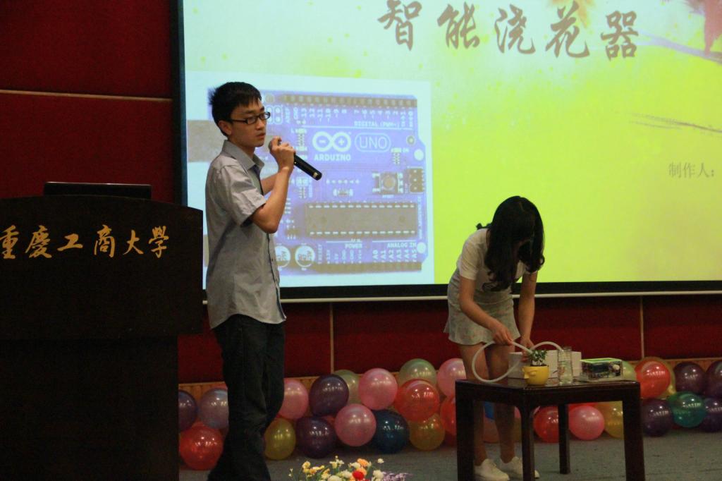 本次大赛历时一个半月,在初赛的激烈角逐中,十组选手脱颖而出,带着他们的小发明来到了现场。决赛精彩纷呈,各种大神作品让观众惊叹。既有护花使者“智能浇花器”,又有实用“微型控温箱”,还有“善解人意”的“手势遥控车”,更有照明、音响、蓝牙、充电宝集于一身的“多功能魔盒”,还有提供app协助的“飞鱼垂钓智能辅助系统”,绚丽惊艳的“逆变器”,体贴入微的, “为装逼而生” 的“3D显示器”,高效快捷的“钞票分类识别整理机”,环保实用的“鞋底拖”。,最终,第七组“V5团队”以体贴入微的作品和超高的人气同时荣获“一等奖”与“最佳人气奖”,而第一、三组选手获得了“二等奖”,第五、六、十组选手获得了“三等奖”,第二、四、八、九组选手则获得了“优胜奖”。计信公司党总支副书记陈亚惠胡卫军副教授、计信公司李明副教授、计信公司梁华老师分别为获奖选手颁奖。最后,计信公司胡卫军副教授为我们选手的技术进行了点评,使在场同学大大受益。