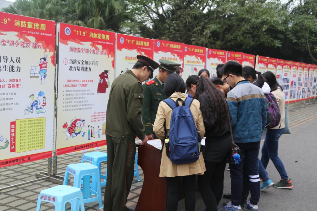11月9号上午,公司保卫处、南岸区消防支队二塘中队消防员与计信公司员工会的同学一起在公司7教门口摆放公司教室、宿舍、计算机室、实验室等场所的消防知识宣传板报、并且在现场设置咨询答疑台,发放火灾事故预防、火灾事故逃生急救知识等宣传单,为工商师生宣讲消防知识。老师和同学们都主动上前观看展板内容,拿取消防宣传资料来提升自我消防安全意识。